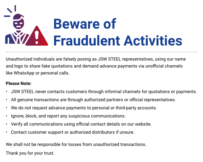 Learn moreJSW Steel is the flagship company of the JSW Group and is one of India's largest integrated steel manufacturers. With state-of-the-art manufacturing facilities located in Karnataka, Tamil Nadu, and Maharashtra, it places innovation and quality at its cornerstone. A manufacturing philosophy that is reflected in everyone among a gamut of steel products Like Hot Rolled, Cold Rolled, Bare & Pre-painted Galvanized & Galvalume, TMT Rebars, Wire Rods and Special Steel.